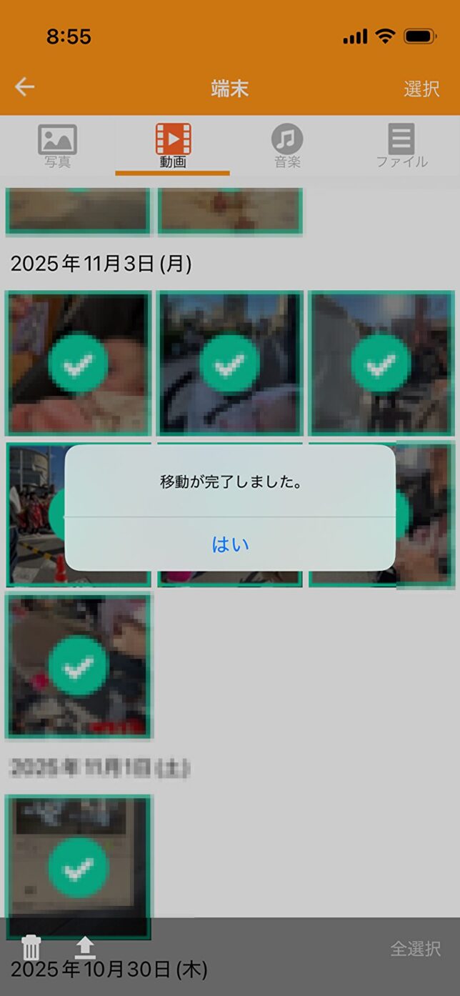 私の場合、一気に1000件ほどの動画を移動させようとしたら、1時間以上経過してしまい全てのデータを移動させる前に、100%近くあったスマホの充電が切れてしまいました。