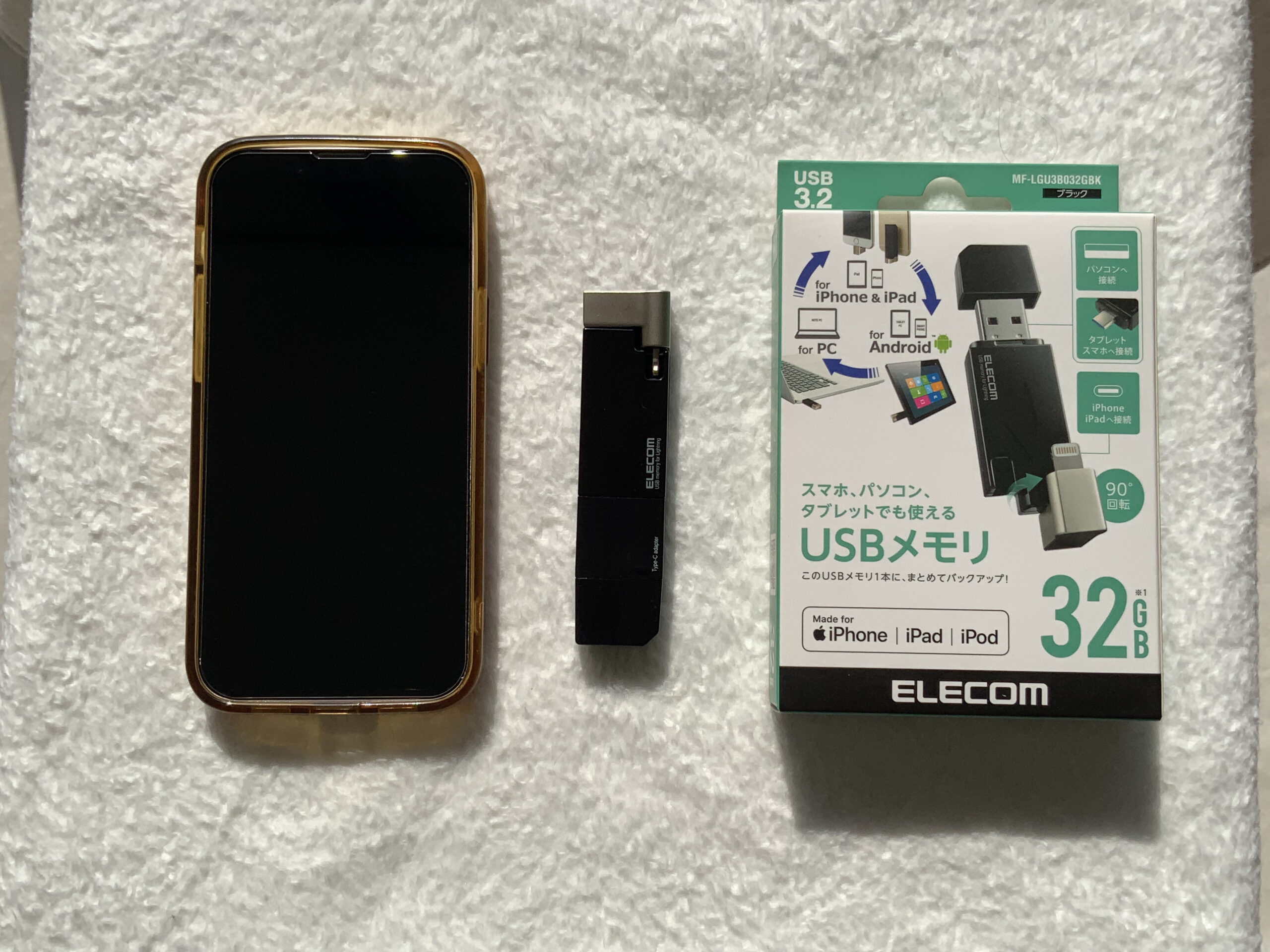 購入したのは、エレコムのUSBメモリで容量は32G。(製品番号MF-LGU3B032GBK)