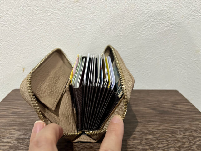 こんなに小さな財布にもかかわらず、カード類を入れる蛇腹式のポケットは、9つもあります。蛇腹式のポケットなので、1つのポケットに2枚入ります。私は、ポイントカードやクレジットカードを含めて13枚のカードを収納しているのですが、全く窮屈感はありません。